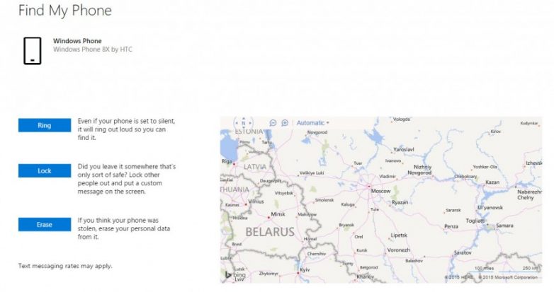 Для того, чтобы увидеть местоположение смартфона, необходимо зайти на специальный сайт, где после выбора устройства сразу будет видна карта и приблизительное местонахождение смартфона. Функции дистанционного управления не отличаются от аналогичных в других ОС. Можно позвонить, заблокировать телефон или удалить с него всю информацию.