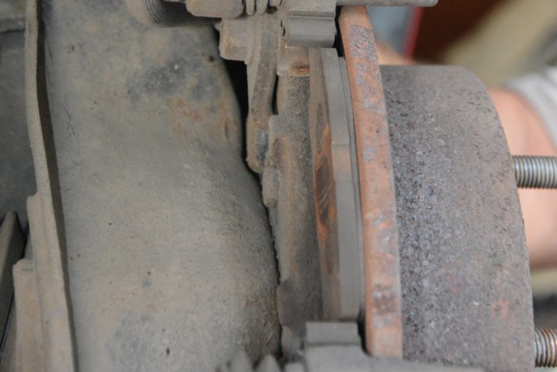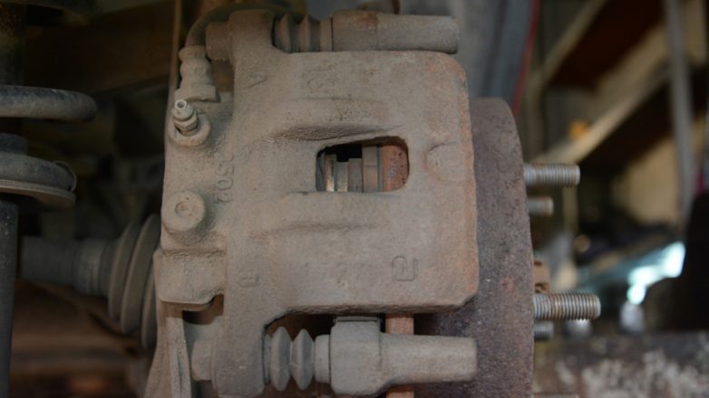 На всякий случай отметим, что пережатие при плохом сценарии развития событий может обернуться замятием металлического «сердечника» тормозного шланга, но у нас обошлось. И мы едем дальше – нам нужно разобрать закисший суппорт.