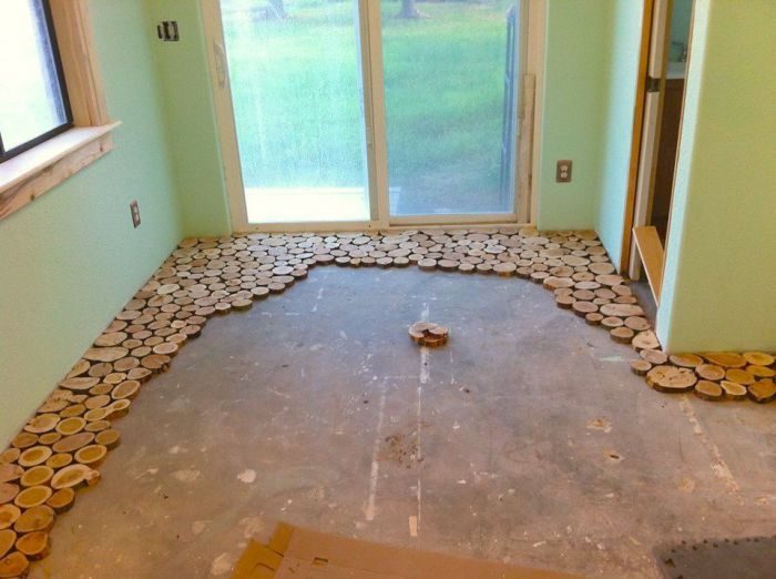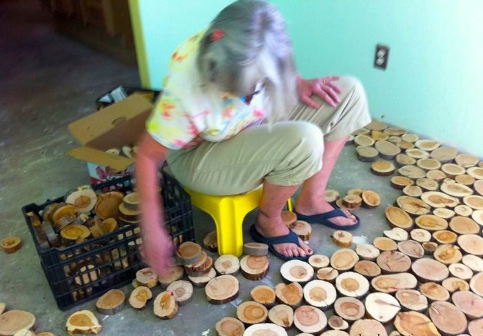 Шаг 2. Хорошенько подмести пол, а затем разложить на нём предварительно отшлифованные деревянные диски.