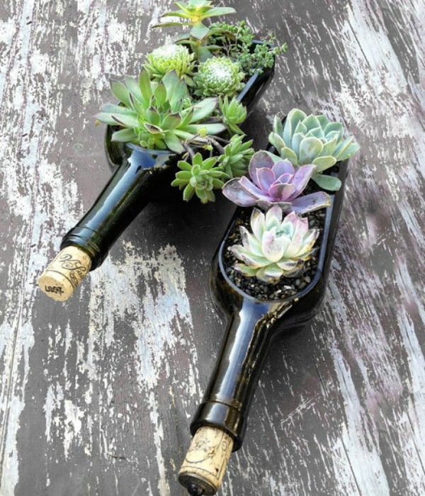 Разрезайте винные бутылки вдоль и поперек и делайте из них цветочные горшки.