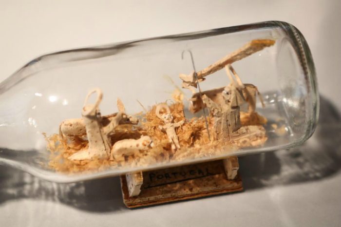 Деревянные фигурки внутри стеклянной бутылки — оригинальное украшение дома.