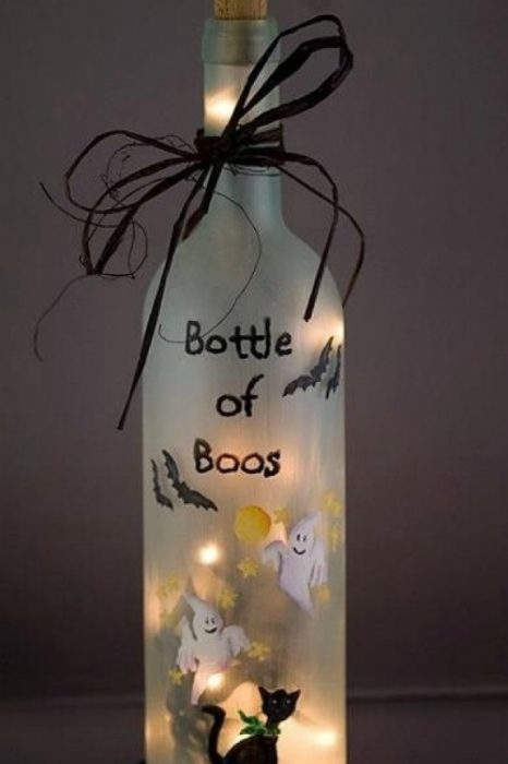 Разукрасьте бутылку специальными красками или сделайте аппликацию, а во внутр вставьте свечку.