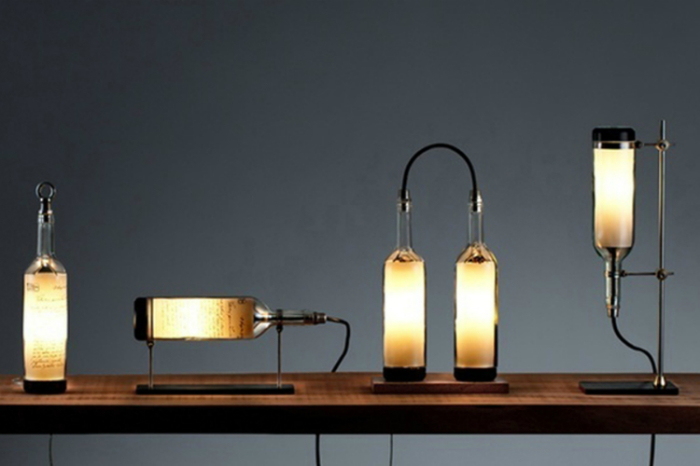 Для создания такого светильника нужно срезать дно винной бутылки и вставить туда лампочку. Дизайн светильника может быть самым разнообразным.