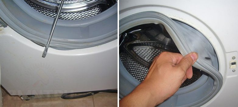 4. Для машинок с горизонтальной загрузкой необходимо снять фиксирующий хомут по окружности уплотнителя со стороны дверцы и снять уплотнитель с пазов. Отсоедините от крышки емкости и от резиновой манжеты все подводящие шланги и датчики, чтобы не повредить их в дальнейшем.