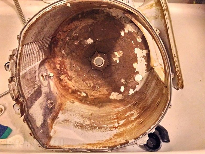 Износу в стиральной машинке в большей степени поддается барабан, суппорты, удерживающие его, суппорты с подшипниками, на которых он вращается. Со временем уплотнители и сальники протираются, вода поступает в подшипник, вымывая смазку и приводя к активной коррозии. Второй вариант — это коррозия опорных суппортов бака, выполненных чаще из алюминия и способных рассыпаться со временем.