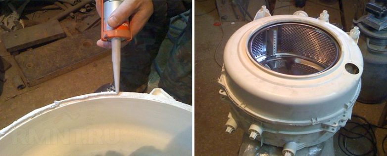 13. На крышке и ответной части емкости для машинок с горизонтальной загрузкой установите новое зеркало с уплотнителем и суппорт с подшипником. Для надежной герметичности лучше обмазать все прокладки силиконовым герметиком непосредственно перед установкой.