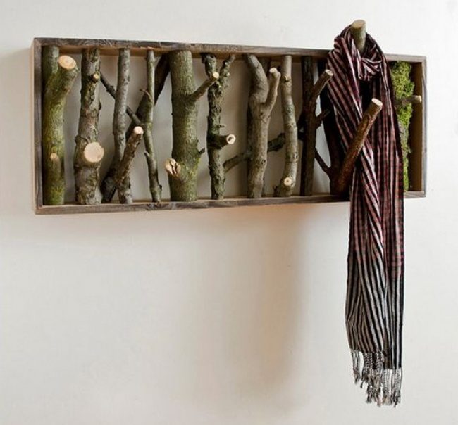 Спилы сухих веток можно использовать как вешалку, поместив их в обычную раму из досок. Недорого и практично — как это сделать, смотрите здесь.