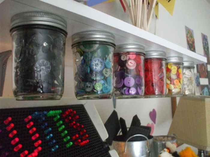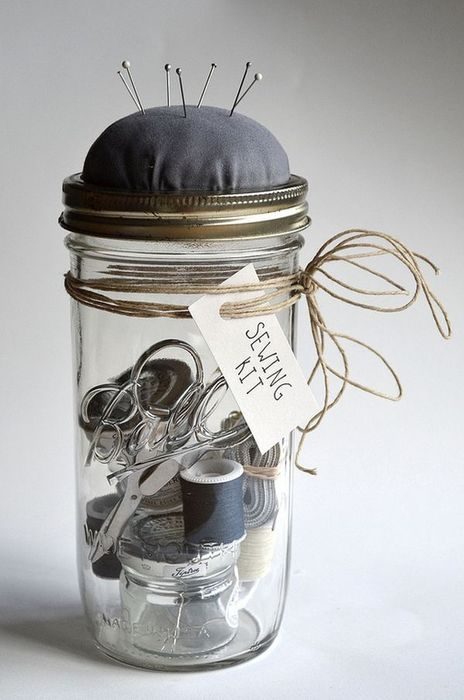 Пуговицы, нитки и иголки куда удобнее хранить в компактной банке с крышкой, чем в коробке или шкатулке. При желании, из крышки можно сделать красивую игольницу.