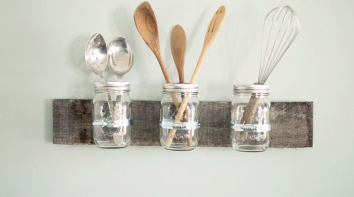 Банки удобно использовать в интерьере кухни, где они смотрятся уместнее всего. В них можно сложить столовые приборы, которые чаще всего используются хозяйкой.
