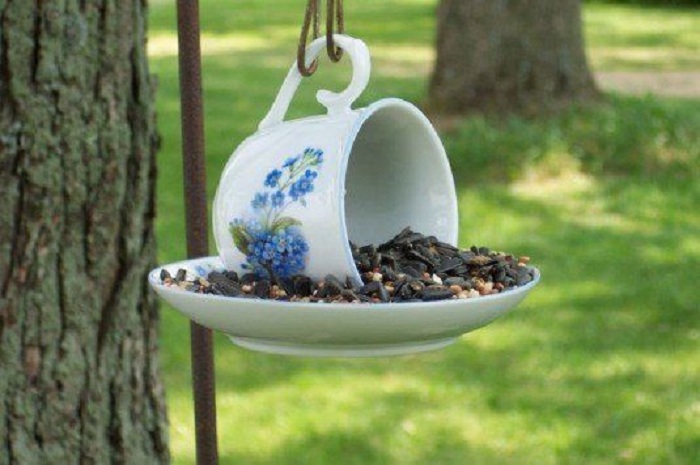 Простое, но удачное решение создать кормушку для птиц с обычной чашки из сервиза.