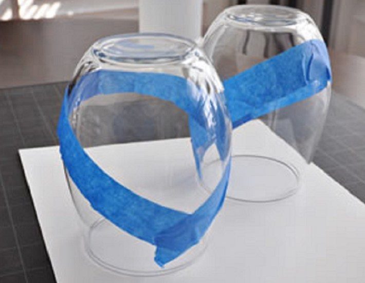 Приклей снаружи к стакану или к любой другой прозрачной посуде полоску клейкой ленты так, чтобы отделить закрашенную поверхность от незакрашенной. Можно поэкспериментировать, выложив необычный узор с помощью клейкой ленты.