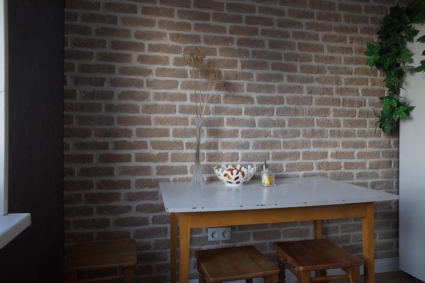 Раздумывали над вариантами отделки стен. На одной из них решили использовать имитацию кирпичной кладки (материал отечественный, от «Феодал»). Примыкающую стену выкрасили в контрастный серый цвет (Alpina, «бетон эффект»).