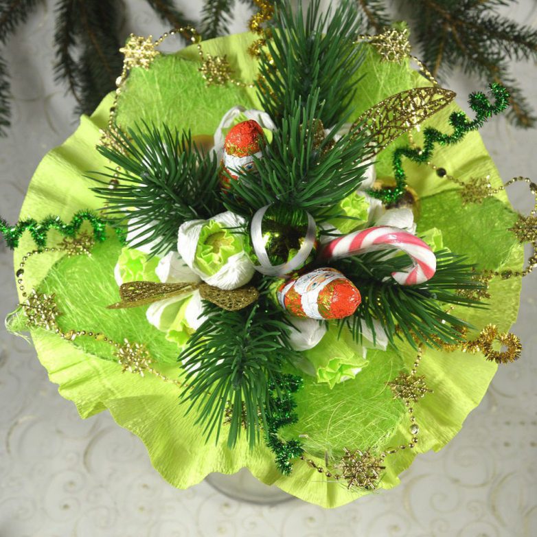 Следующий вариант – это букет. Конечно же, не из цветов, так как дарить их в Новый год неприятно, да и просто этот праздник не особо располагает к наличию живых цветов. А вот букет из сладостей, самое то. Можно купить кучу разных шоколадных конфет, леденцов и жвачек, приклеить их на деревянные тонкие палочки и перевязать всё это красивой лентой с бантом, оформив в букет.