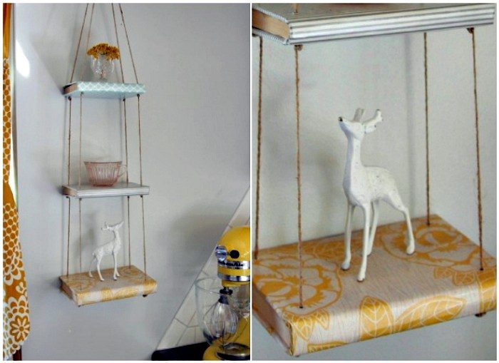 Очаровательная подвесная полка, которую можно сделать из нескольких ненужных книг или блокнотов одинакового размера. Такая полка не только подойдет для хранения косметических принадлежностей и небольших предметов декора, но и сама по себе станет прекрасным украшением любой стены.