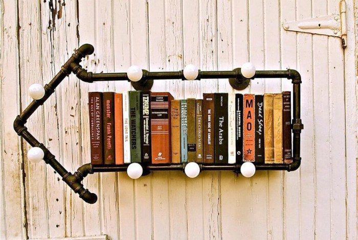 Стильная книжная полка в виде стрелки с подсветкой, сделанная из остатков металлических водопроводных труб, прекрасно впишется в интерьер комнаты мальчика-подростка или квартиры холостяка.