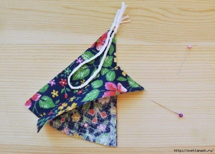 Определите для себя размеры саше. Это может быть достаточно маленькая елочка или саше средней величины. Затем выкройте по два треугольника из ткани выбранного цвета (нижний край треугольника должен быть немного загнутым).