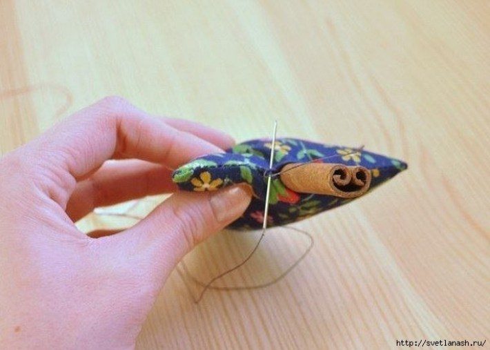 Только не забудьте край корицы, который будете вставлять в саше, прикрыть кусочком синтепона, иначе маленькие кусочки наполнителя будут высыпаться. Зашейте отверстие с обеих сторон ствола и вот готово ваше ароматное новогоднее саше.