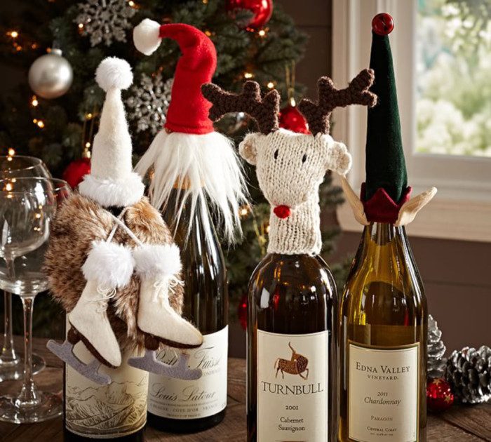 Сшить маленькие шапочки для бутылок можно за пару минут из остатков ткани и искусственного меха, которые найдутся в каждом доме. Также их можно связать.