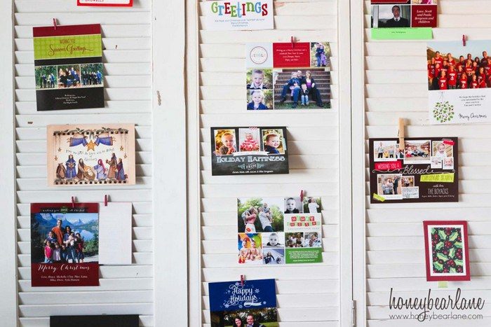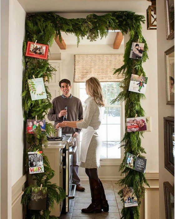 Создайте действительно зимнее настроение, украсив вход в комнату или квартиру еловыми ветками, и прикрепив на них праздничные открытки с помощью деревянных прищепок.