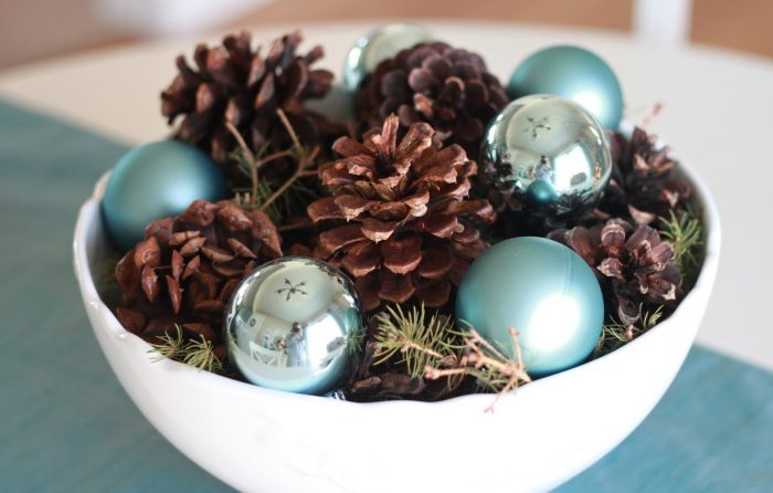 За считанные минуты можно сделать декоративную композицию из новогодних шариков и сосновых шишек. Просто наполните ними красивое блюдо. Сочетание кардинально разных фактур – ровной блестящей и грубой шероховатой, — выглядит очень оригинально.