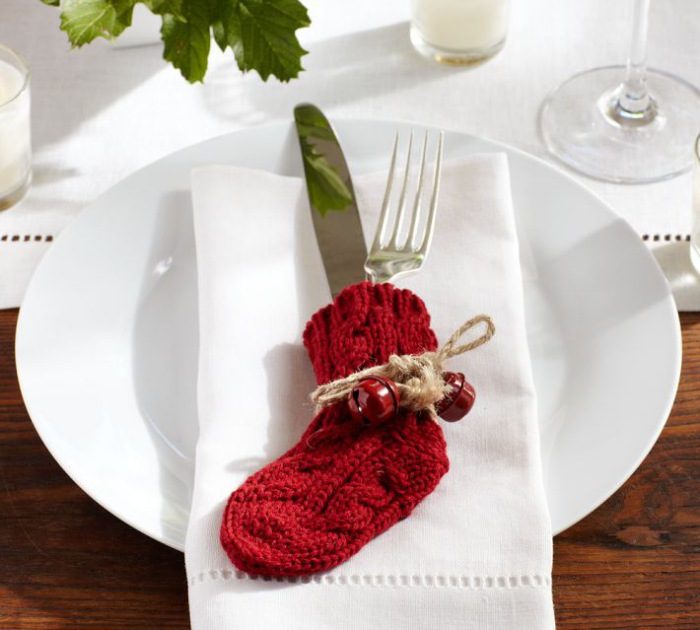 Обернуть столовые приборы в тканевые салфетки – универсальное решение для всех праздников. Но в Новый год так хочется чего-то особенного. Вместо привычных салфеток в качестве декора новогоднего стола используйте маленькие вязаные носки. Если возиться со спицами и нитками нет желания, то просто приобретите их в детском магазине. Рекомендуем обратить внимание на модели в традиционных для новогодних праздниках цветах – зеленом и красном. В продаже есть и детские носки с новогодними изображениями.