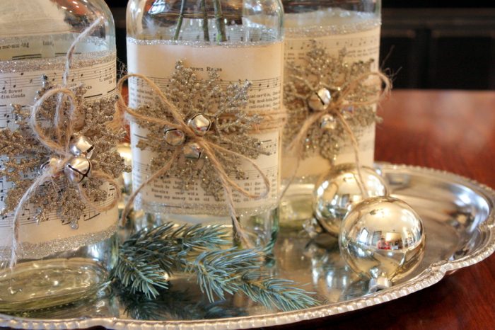 Без различных напитков в стеклянных бутылках не обходится не один новогодний стол. Важное преимущество декорированных бутылок – это, что, в отличие от других украшений, он не занимают дополнительное место на столе. Декорировать можно и закрытые бутылки, сняв с них этикетки. Например, окрасить в яркий цвет или обклеить пайетками.
