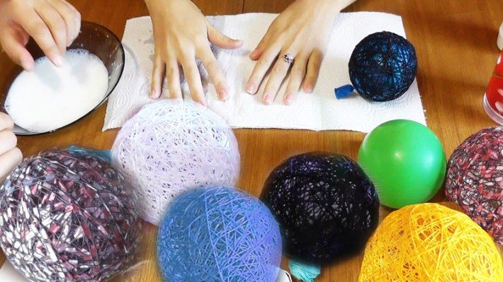 Смешай сахар, воду и клей. Полученная смесь послужит клеем. Соотношение ингредиентов можно варьировать. Например, если добавить побольше сахара и клея — шар получится почти как проволочный.Надуй необходимого размера воздушный шарик. Обмотай его смоченной в растворе ниткой. Оставь его сохнуть.