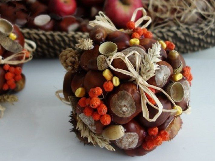 Природные украшения, собранные во время прогулки с ребенком, станут отличным декором для старых новогодних игрушек.