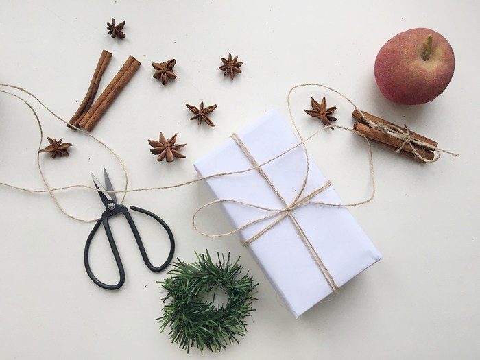 Тем временем перевязываем коробку с подарком шпагатом. Будет хорошо, если сверху вы оставите небольшой бантик — на него нужно закрепить веночек.