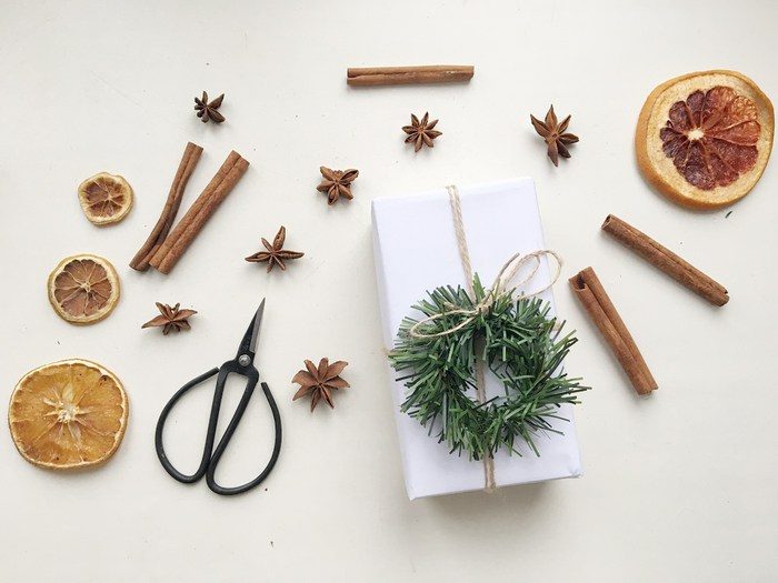 Обернув коробку, переходим к декору: берем искусственную ель (это может быть, например, кусочек старой гирлянды) и отрезаем небольшой хвостик, который затем сворачиваем. Маленький декоративный веночек готов!