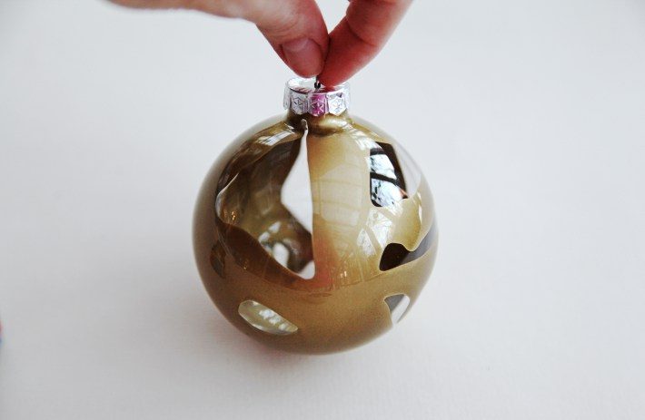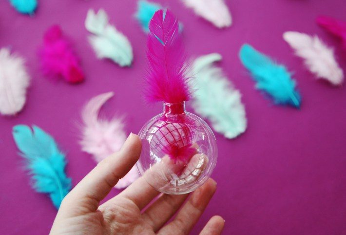 Ещё два самых быстрых после помпонов способа украсить пустые шарики – это краска и цветные декоративные перья. В моём случае я использовала густую краску для стекла. Капнув пару капель на внутреннюю поверхность, я поворачивала шарик в разные стороны, чтобы получился произвольный абстрактный узор. Главное, не переборщить с краской, иначе промежутки заполнятся полностью и весь смысл идеи потеряется.