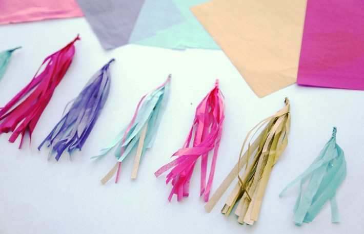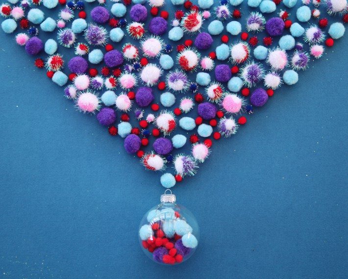 Приятнее всего возиться с яркими и пушистыми материалами, типа помпонов и шуршащей бумаги тишью. Помпоны оказались самой быстрой идеей и при этом одной из самых эффектных.