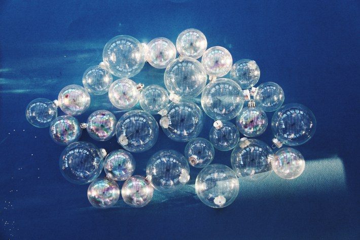 Всё, что мне понадобилось для создания игрушек, – это пустые стеклянные и пластиковые шары. Если вы делаете шарики с детьми, то им можно вручить более безопасный и небьющийся пластик, а самим заняться декором стекла. Я заказала шарики в одном из интернет магазинов со средней ценой приблизительно в 70 рублей за штуку. Удивительно, но найти в Москве простые прозрачные шары без рисунка оказалось не так-то просто. Нужно сказать, что стеклянные игрушки смотрятся красивее, на вид они воздушнее и прозрачнее пластиковых. Все вместе они напоминают радужное облако мыльных пузырей!