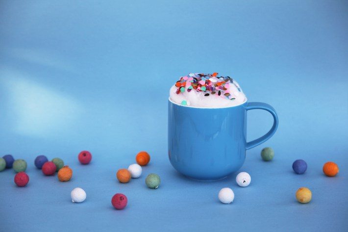 Пожалуй, более безотходного производства представить сложно :). Я решила наполнить один из шариков горкой конфетти, а потом и остальные материалы стали напрашиваться внутрь стеклянной сферы. Кстати, насчёт игровой формы этого занятия – лишние конфетти превратились в процессе съёмки в цветную посыпку для капучино, которое получилось у меня из попавшейся под руку ваты. Как видите, остановить фантазию с каждой сделанной игрушкой становится сложнее!