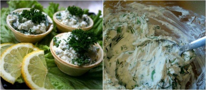 5 желтков + 2 ст. л. измельченной зелени + 1 ст. л. творожного сыра + 1 ст. л. майонеза + 1 ч. л. горчицы. Желтки разомни вилкой, смешай с остальными ингредиентами.