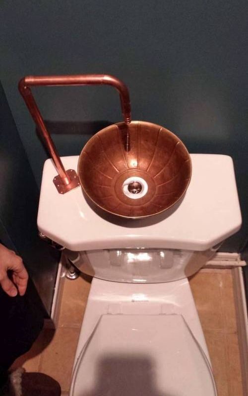 В целях экономии воды глава одной американской семьи соорудил весьма интересное устройство в собственном туалете. К сливному бачку унитаза мужчина приделал небольшую раковину, которая позволяет вымыть руки после посещения туалета, а использованная при этом вода наполнит бачок и будет использована для слива.