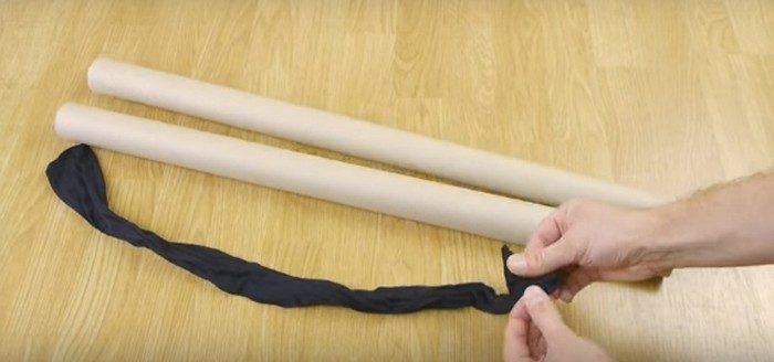 Сквозняки в квартире – невидимый (в буквальном смысле) враг вашего здоровья и зимой, и летом. Но решить проблему можно быстро и бюджетно. Сделайте специальный стопер. К примеру, используйте пару капроновых колготок и два тонких рулона с остатками обоев. Для этой же цели подойдут картонные «втулки» от постеров, а в некоторых случаях сгодятся даже рулоны пищевой фольги или плёнки. Отрежьте от колготок один чулок, в него положите оба рулона и разместите под дверью, как на фото. Сквозняк не пройдёт! А дверь будет открываться-закрываться без проблем.