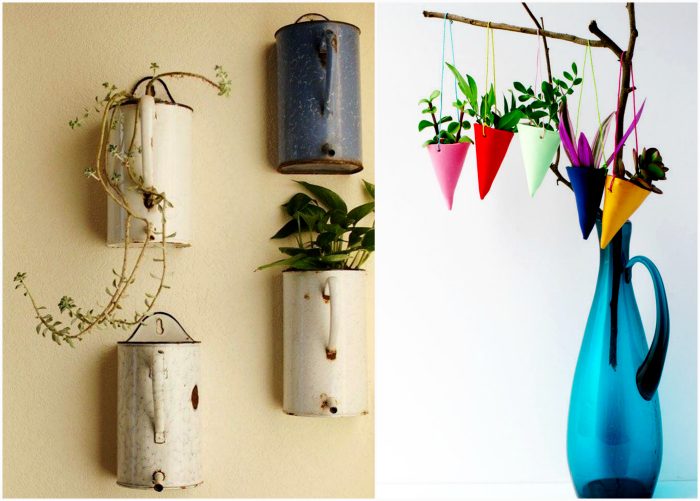 Освежить интерьер, сделать его более красочным и уютным помогут комнатные растения в оригинальных горшках, которые можно сделать из жестяных банок, лампочек, винных пробок, старых чашек и любых других оригинальных вещей. Подобные горшочки можно развешивать под потолком, украшать ими стены и подоконники.