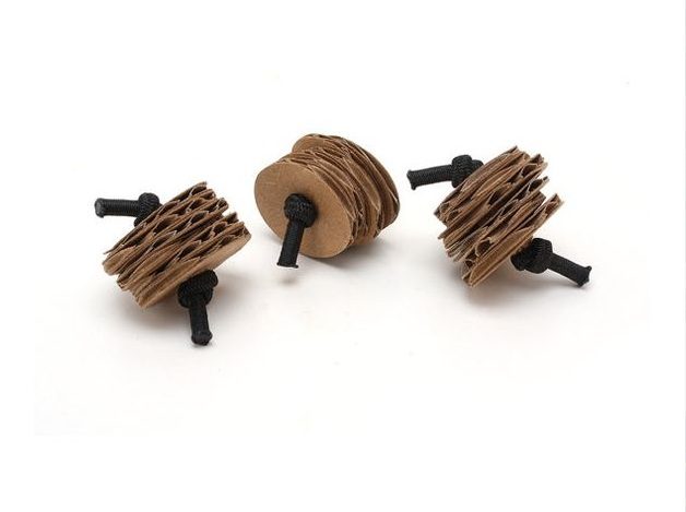 Гофрированный картон, из которого делают крупные коробки, пригодится для создания игрушки для кота. Нарежьте из него множество кружочков, в каждом из них сделайте посередине небольшое отверстие. Затем нанижите их на кусочек шнурка, завязав его на узелки.