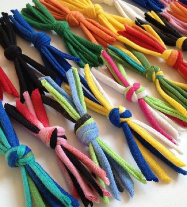 Для изготовления такой игрушки для кота своими руками потребуется старая трикотажная футболка. Нарежьте ее на тонкие полоски, сложите их вместе и свяжите узлом. Чтобы коту было интереснее, рекомендуем использовать футболки разных цветов и отличающиеся по плотности трикотажа.