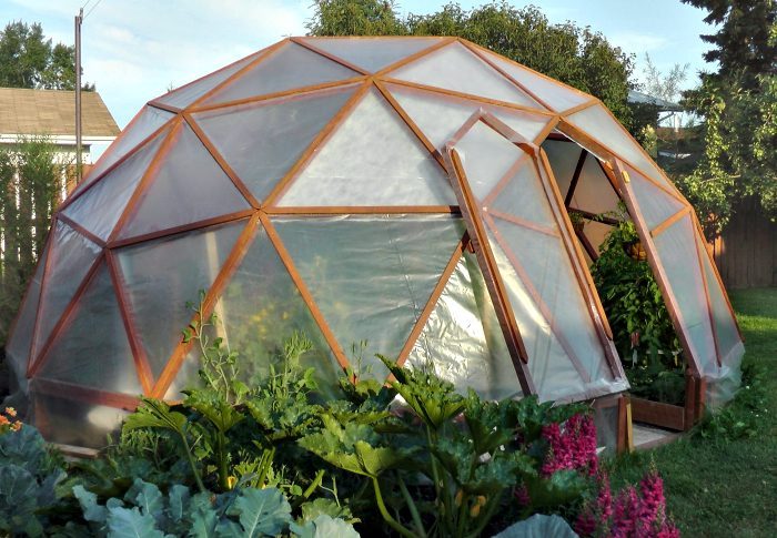 Большая многоугольная теплица, каркас которой построен из дерева, покрытого обычной клеенкой. Несмотря на сложность изготовления, такая куполообразная конструкция отличается привлекательным внешним видом, устойчивостью и прекрасной освещенностью.