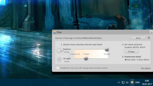 Крохотная, но оттого не менее полезная утилита f.lux подстраивает цвета дисплея под время суток. Вам нужно лишь указать свой населённый пункт и условия освещения. После этого f.lux будет снижать к вечеру яркость и интенсивность синего света, который, как известно, подавляет выработку гормона сна. Это поможет вам соблюдать правильный режим и уменьшит нагрузку на глаза.
