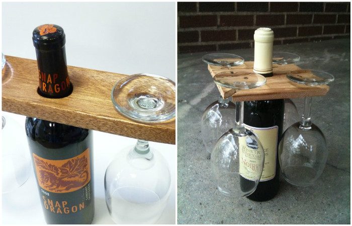 Если необходимо сэкономить место на небольшом столе, то сделайте держатель для бокалов из винной бутылки. Кроме того, такой способ сервировки выглядит необычно и позволит разнообразить застолье. Просто сделайте отверстия или пропилы на деревянной доске подходящего размера.