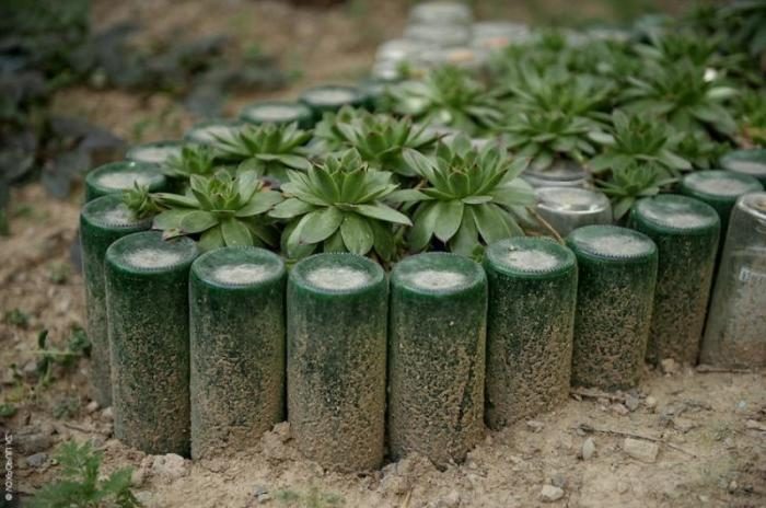 Вкопайте в землю горлышки бутылок, плотно утрамбовывая почву вокруг них. Затем заполните землей пустое пространство, образовавшееся между выступающими частями бутылок. Теперь можно приступать к высадке растений в новую клумбу. ее плюс в том, что при необходимости конструкцию легко разобрать.