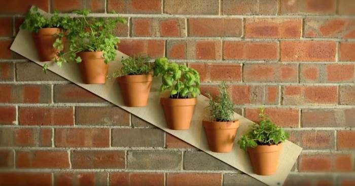 Вертикальное украшение стен растениями в горшках из жестяных банок.