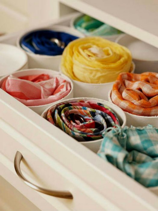 Небольшие куски ПВХ-труб среднего диаметра можно использовать для создания практичного органайзера для носков, колготок, трусов и шарфов в выдвижном ящике.