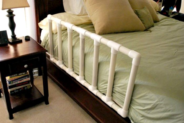 Чтобы ребенок или пожилой человек ненароком не упал с кровати, оборудуйте ее края простыми бортиками, сделанными из пластиковых труб.