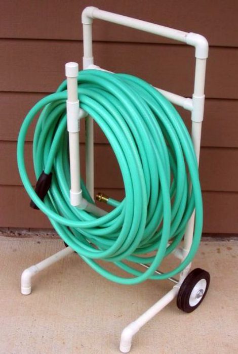 Чтобы длинный садовый шланг не путался под ногами, для него можно изготовить простую и практичную подставку из пластиковых труб.