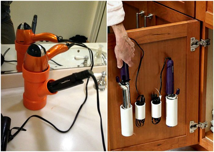 Пластиковые трубы и их комплектующие можно использовать для создания различных подставок для фена, плоек и щипцов для завивки волос.