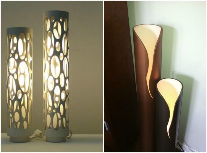 Творческие личности могут постараться и смастерить из ПВХ-труб уникальные и очень эффектные светильники. Для этого трубы можно покрасить, декорировать фигурными вырезами, блестками и любыми другими материалами и вставить цоколь с лампочкой.